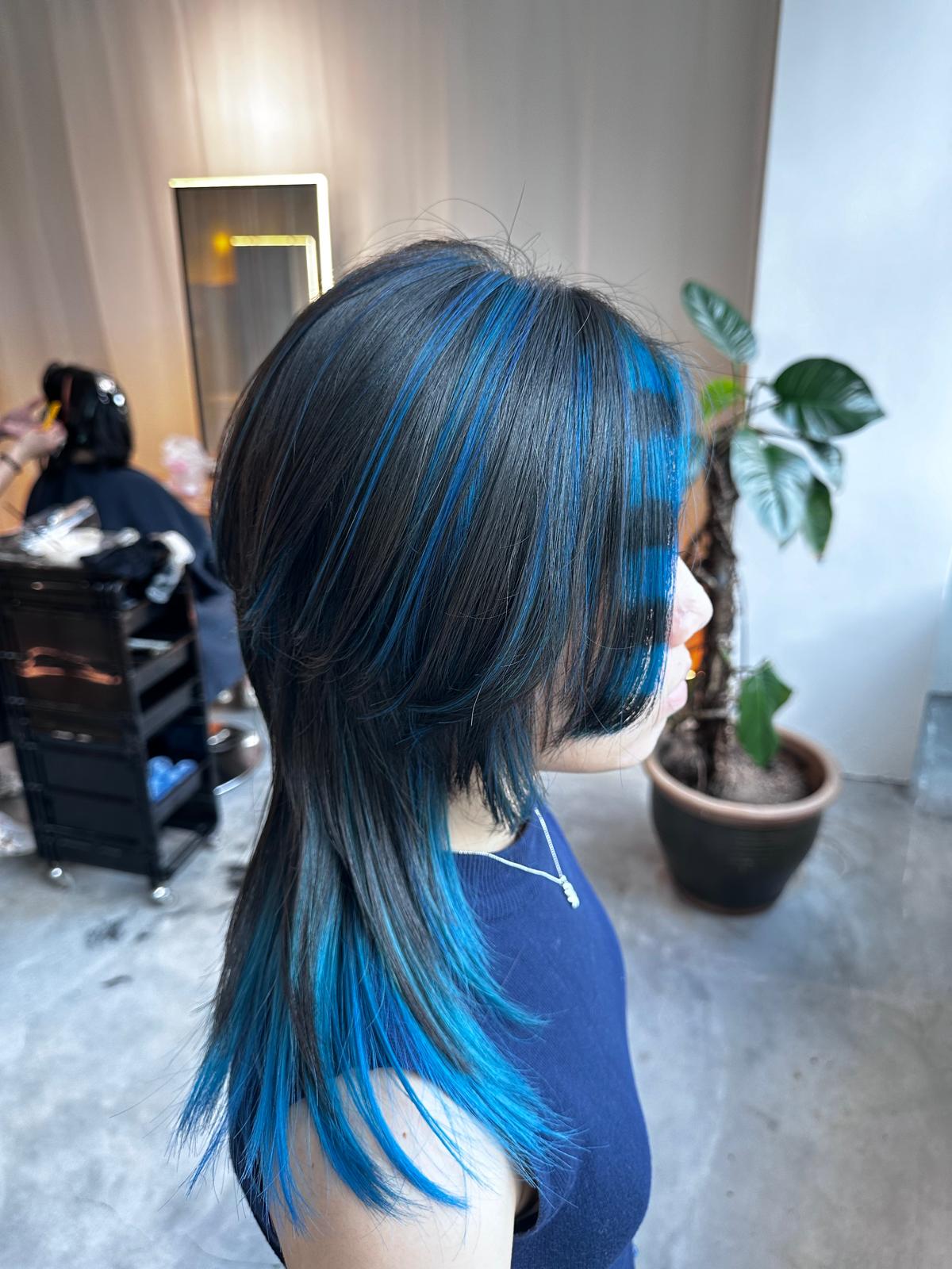 Layered wolf haircut with deep blue raccoon highlights, inner bleach and fringe design at Japanese hair salon Singapore