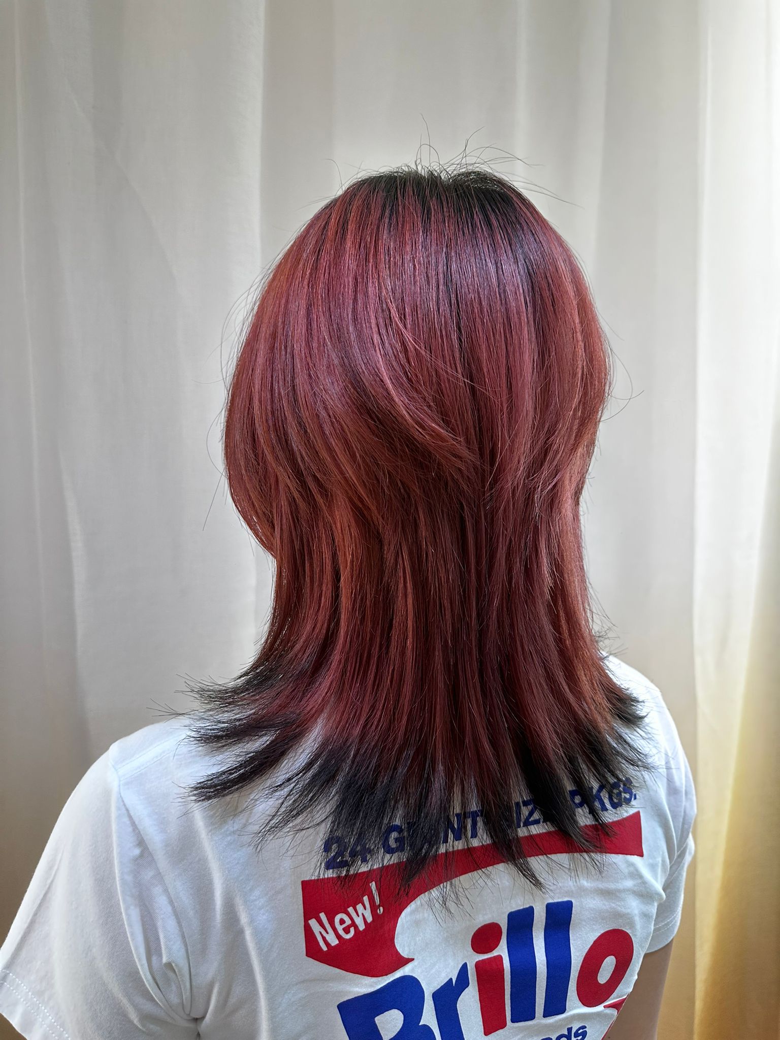 这款造型以中长度狼尾剪裁(Medium Wolf Cut)为基础,整体染成樱桃红色,发尾加入可褪色的黑色设计,让风格更有层次与个性。