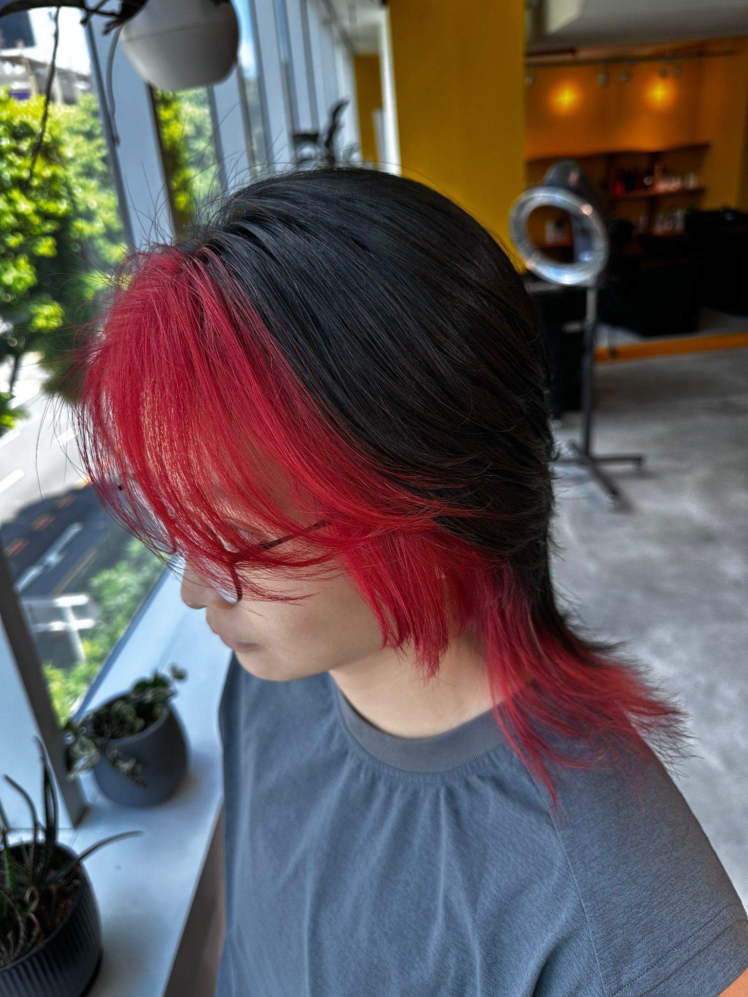 Face line bleach with vivid red many-piece color on a medium wolf cut at Colors Japanese Hair Salon Singapore, bold point color design