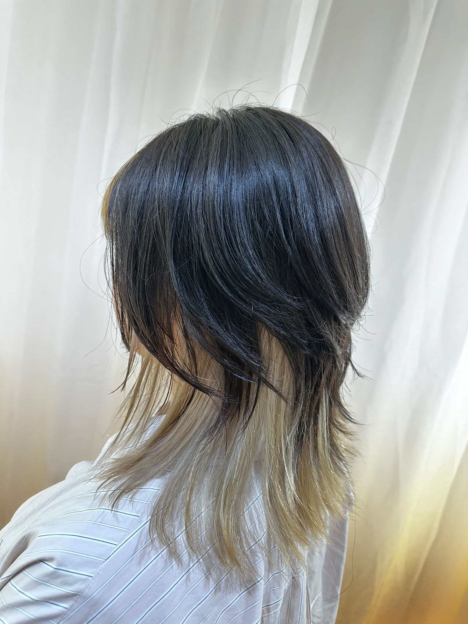 这款造型结合了内层漂发与狼尾剪裁(Wolf Cut),表面保持自然发色,内层则提升至高明度的白黄色,在低调中展现个性。