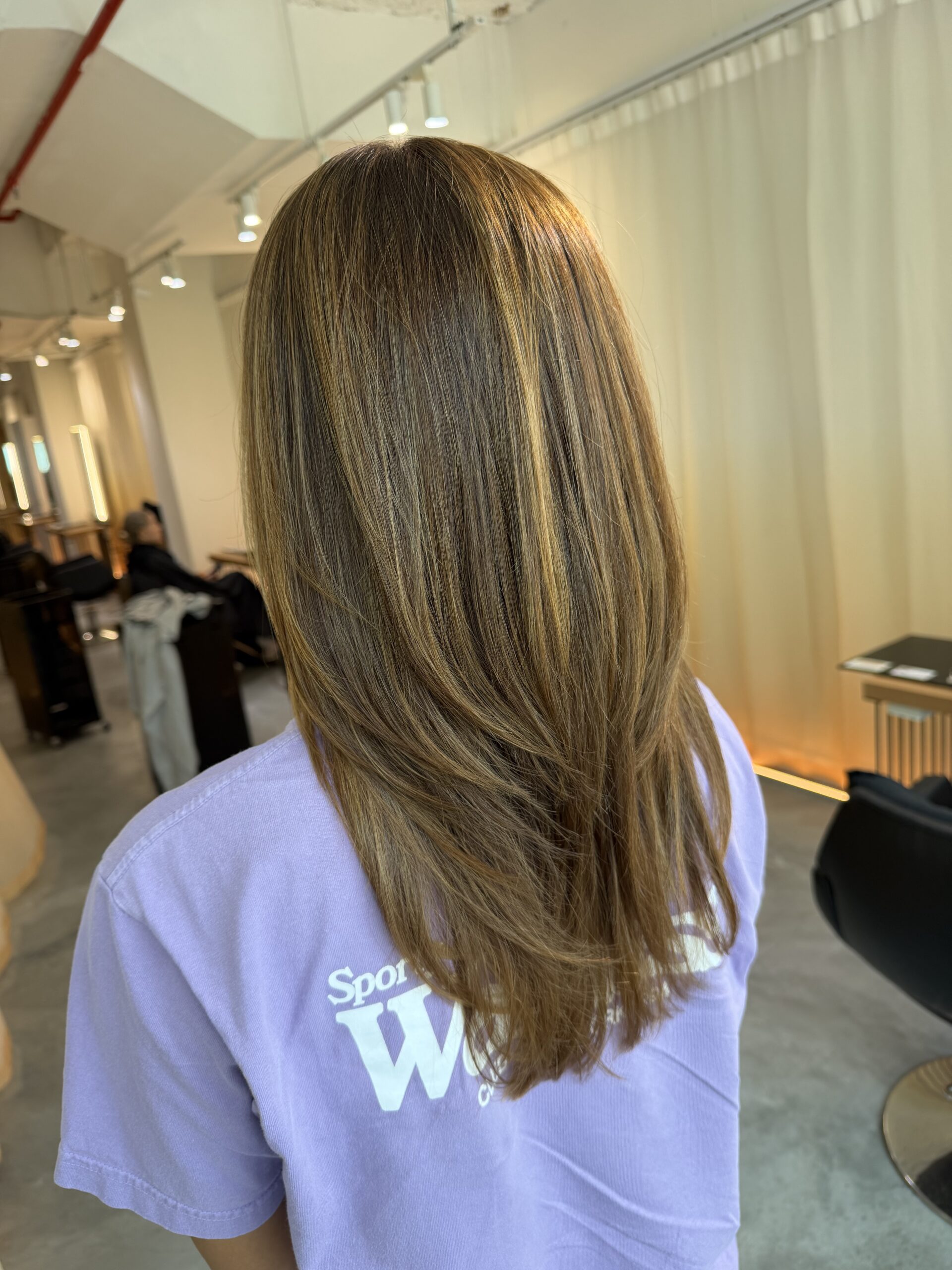 这款发型是在 Japanese Hair Salon Singapore 完成的长发层次剪发搭配米色挑染(Beige Highlights)。
