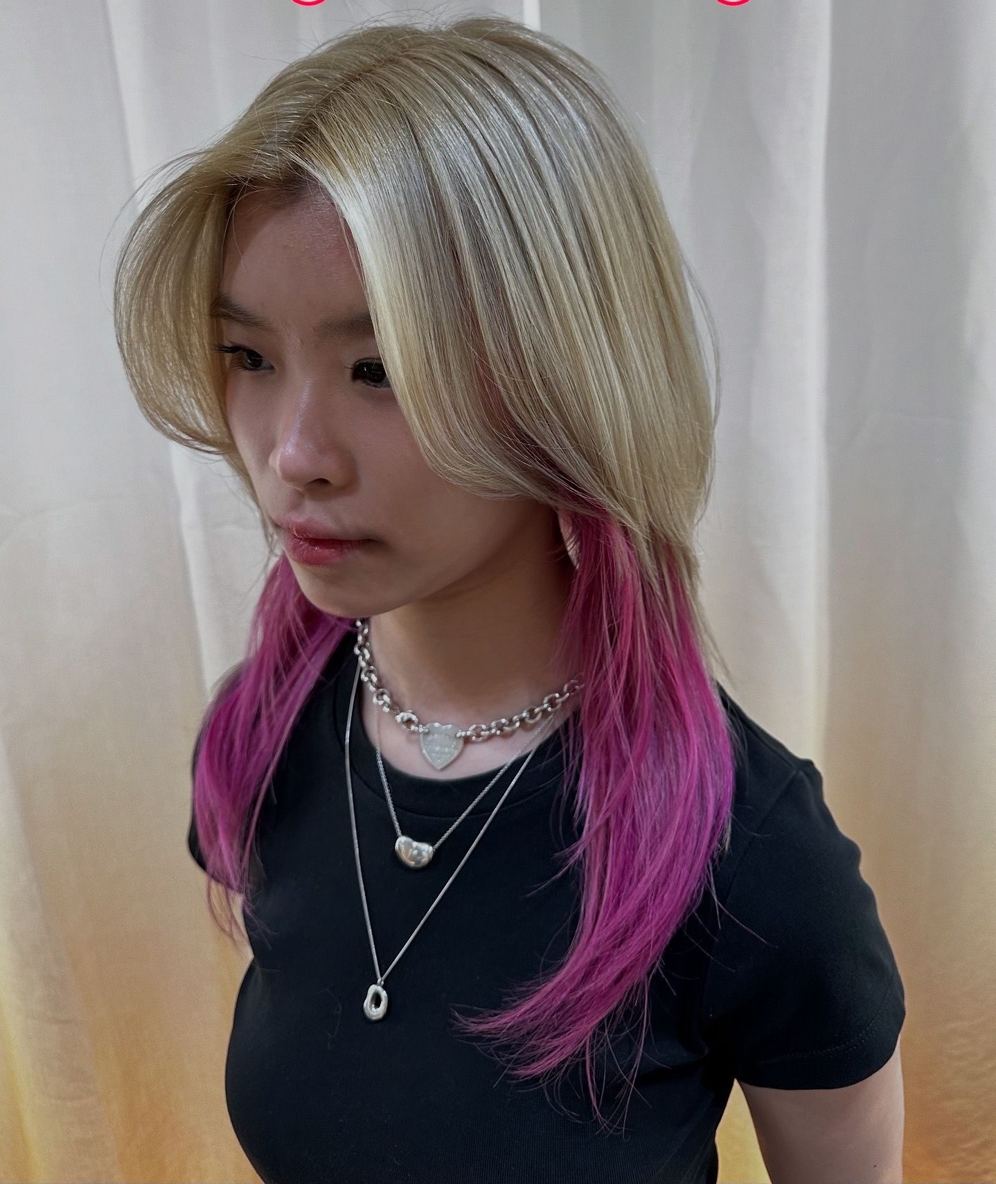 漂染过程中使用PLEX 低损伤技术,在保证发色清晰度的同时保护发质结构。粉色带来个性与温度,黄色灰调则平衡亮度,使整体更耐看、更高级。