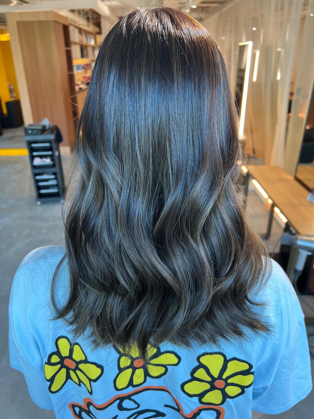 Plex color with fine highlights on long layered hair at Colors Japanese Hair Salon Singapore, soft ash tone for Asian hair with added shine and volume near Clarke Quay