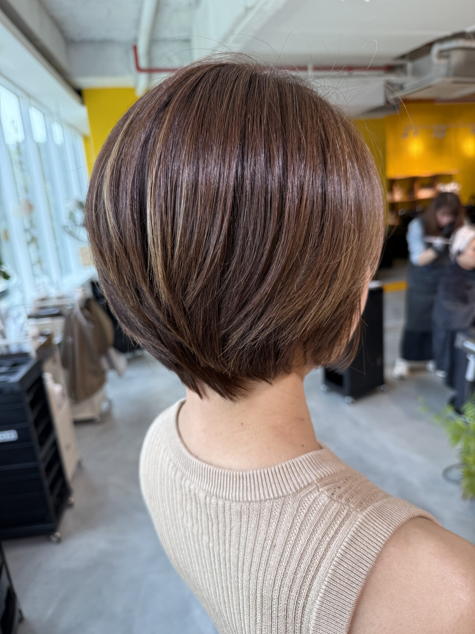 Colors Japanese Hair Salon Singapore short haircut with gold brown grey blending highlights for white hair, clean neckline and balanced volume