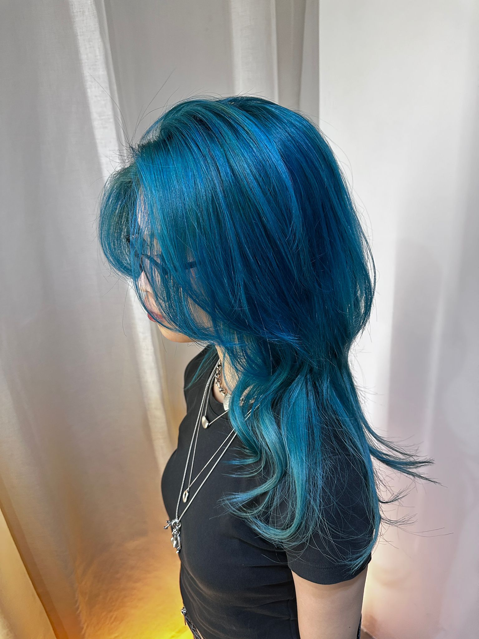 このカラーはブリーチが必須で、髪質によっては2回のブリーチが必要になる場合があります。ベースをしっかり明るくすることで、エメラルドブルーの鮮やかな色味を綺麗に出すことができます。