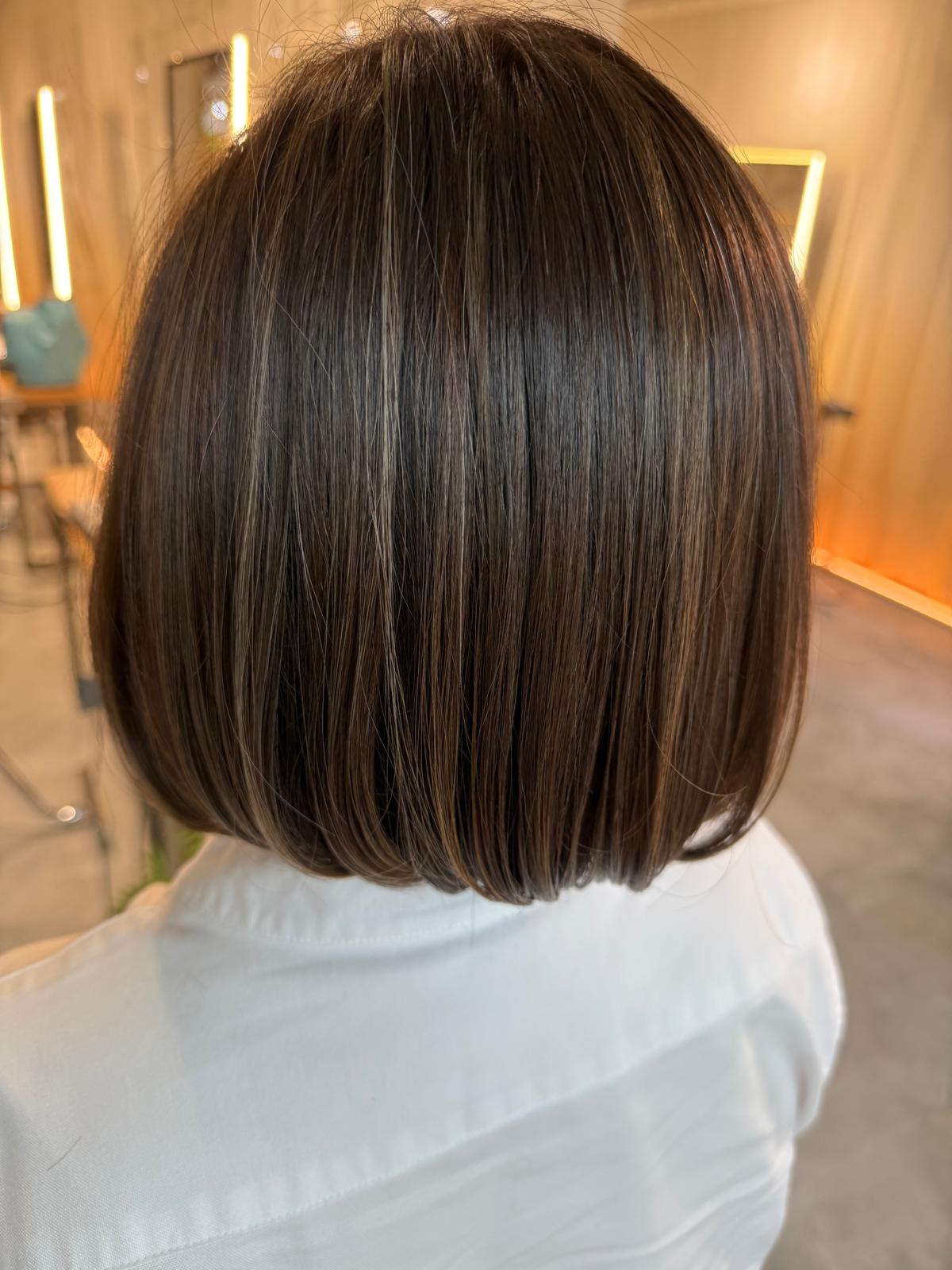 白髪を無理に隠すのではなく、ハイライトで馴染ませるグレイブレンディングと、コンパクトなボブは非常に相性が良い組み合わせです。色味は肌馴染みの良いベージュ系で、コントラストを強くしすぎず柔らかく仕上げます。カラーはプレックス配合で、トリートメントしながら施術するため、艶と強度を保ちながら低ダメージで仕上げます。