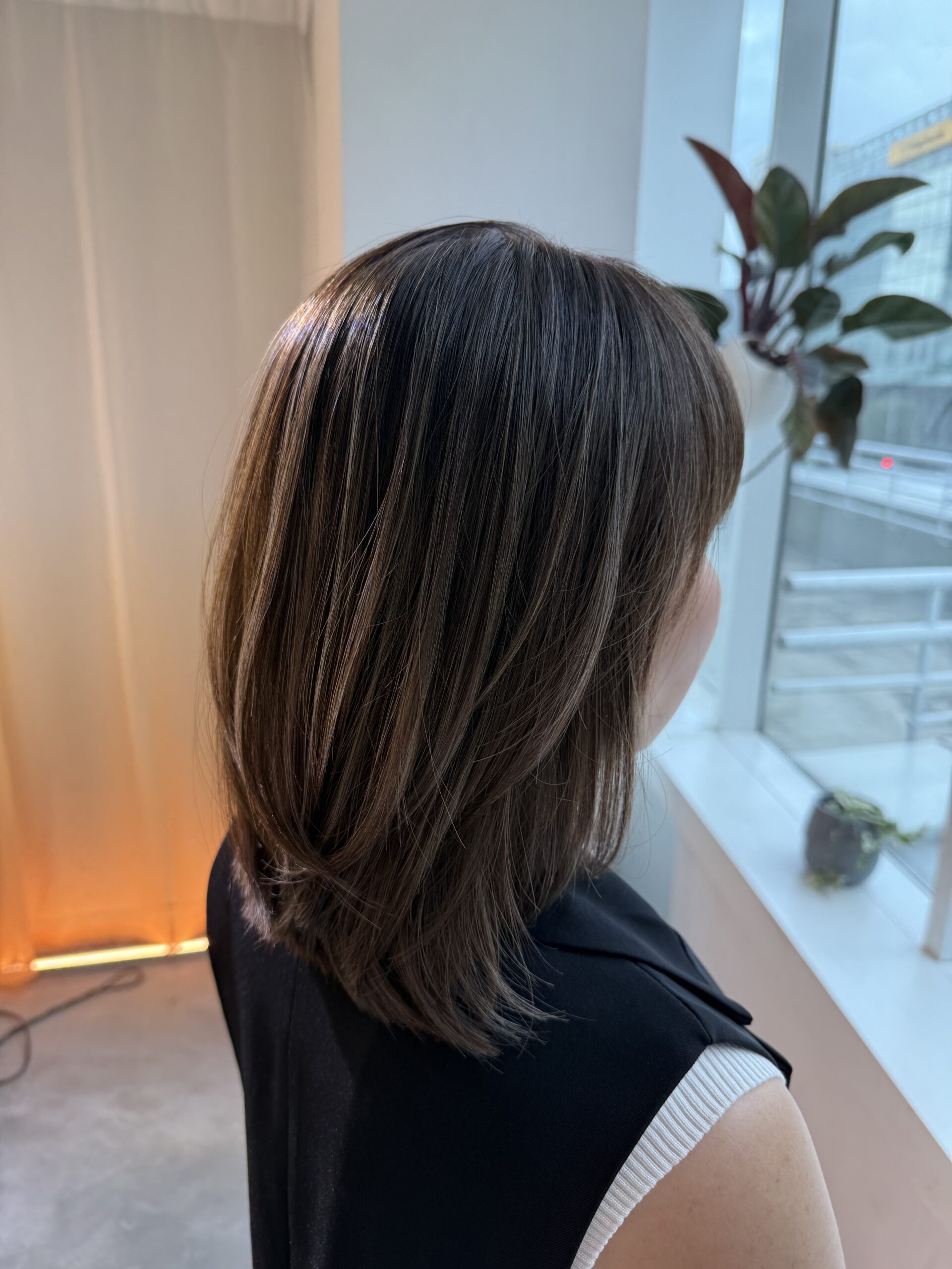 細かいハイライトと明るめのベースカラーを組み合わせることで、白髪を柔らかく馴染ませます。太い筋感を避け、上品で立体感のある仕上がりに。カットはミディアムのローレイヤーで、毛先の重さを残しながら自然な動きを出します。ハンドブローでも形が作りやすく、扱いやすいスタイルです。カラーはプレックス配合で、艶を保ちながらダメージを抑えます。