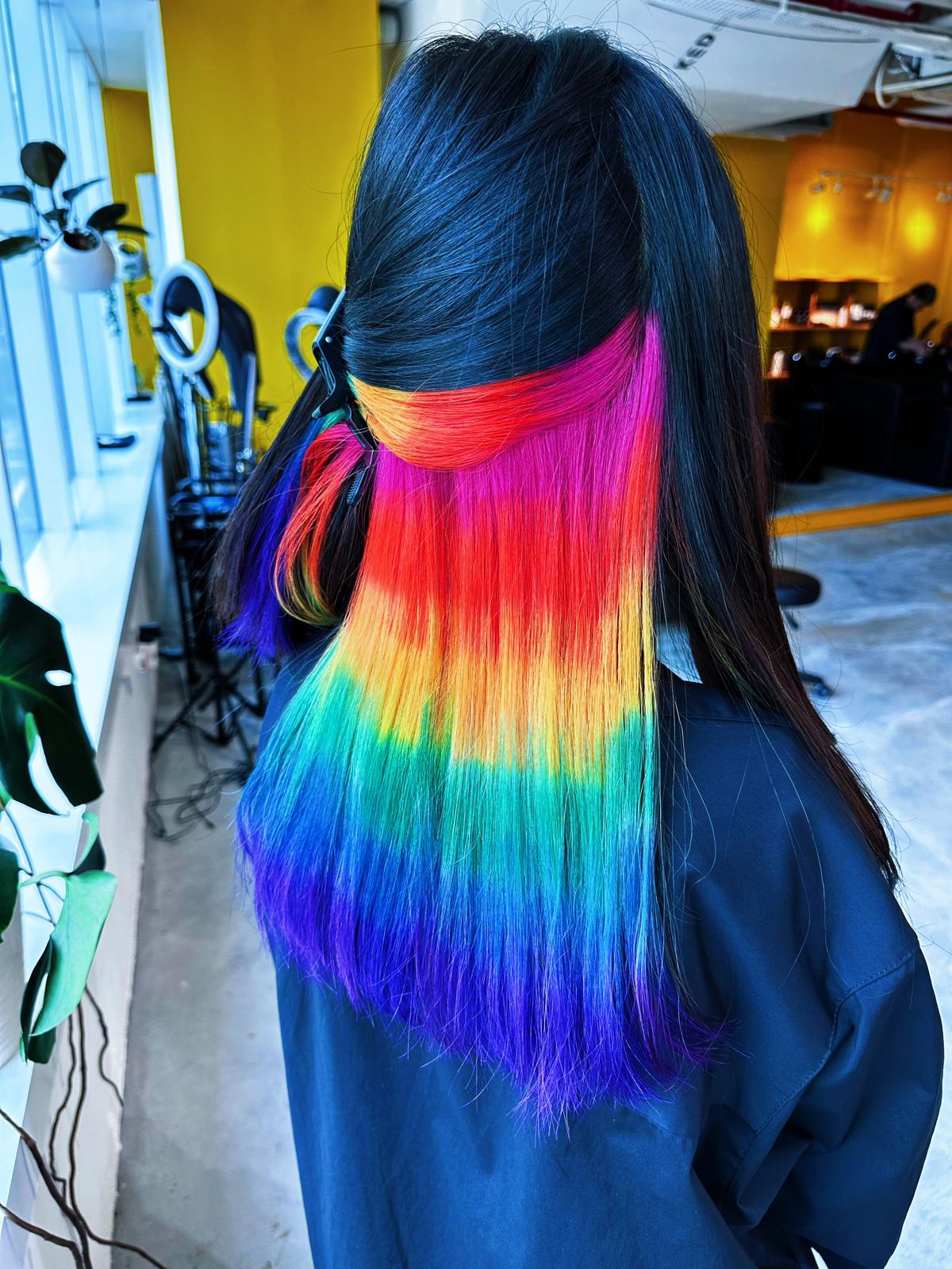 シンガポールでインナーレインボーカラーをお探しですか?Rainbow hair Singapore や ダブルブリーチ デザイン near me で検索している方におすすめのスタイルです。日系美容室の繊細な技術で仕上げる高彩度デザインです。