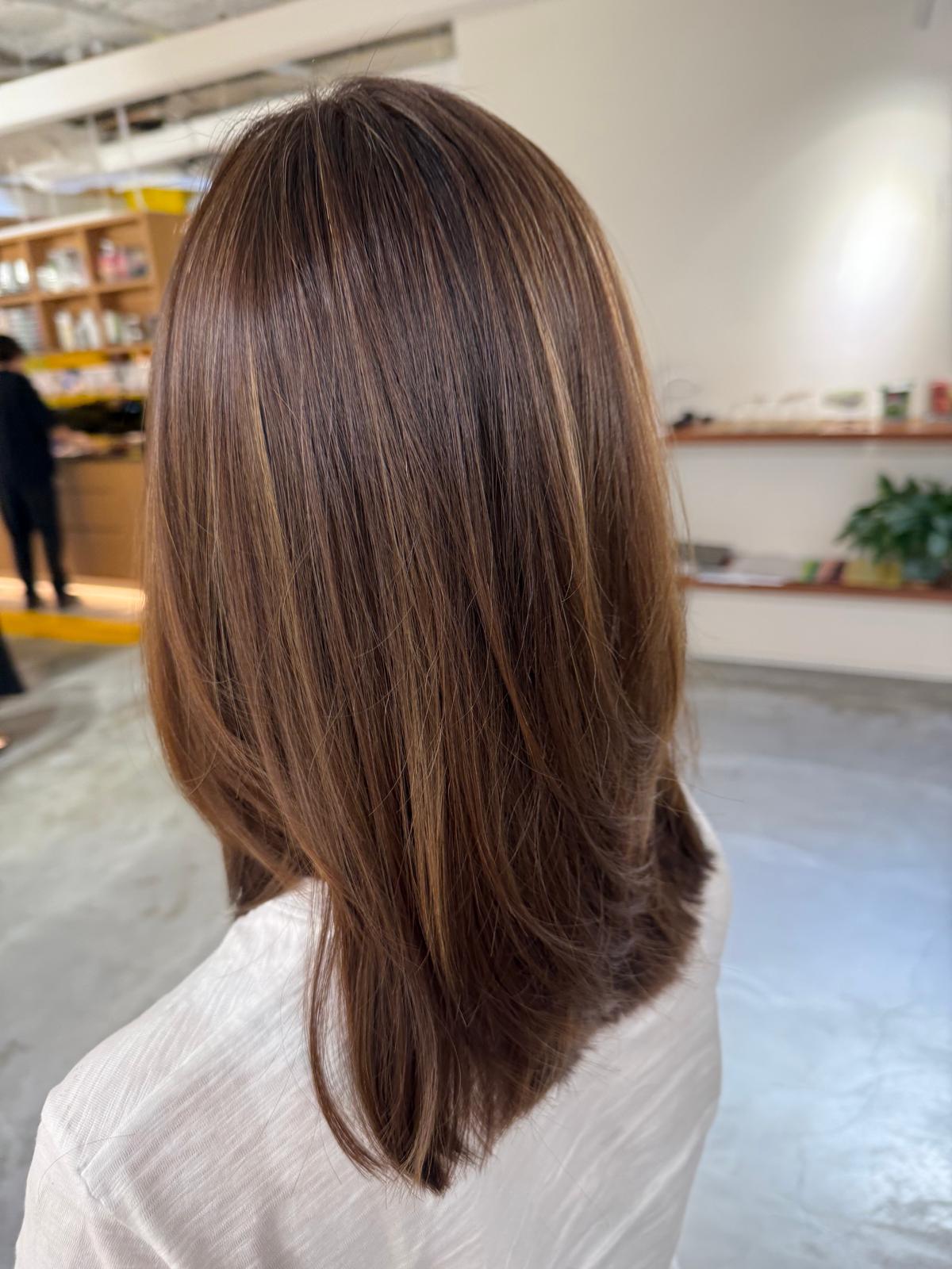 ベースに自然な陰影を作りながら、ミルクティーベージュのハイライトを重ねています。カットはローレイヤーで、まとまりを保ちつつ動きを出す設計。プレックス配合カラーなので、ブリーチを使用してもダメージを最小限に抑え、艶と柔らかさを維持します。湿気の多いシンガポールでも広がりにくいシルエットです。
