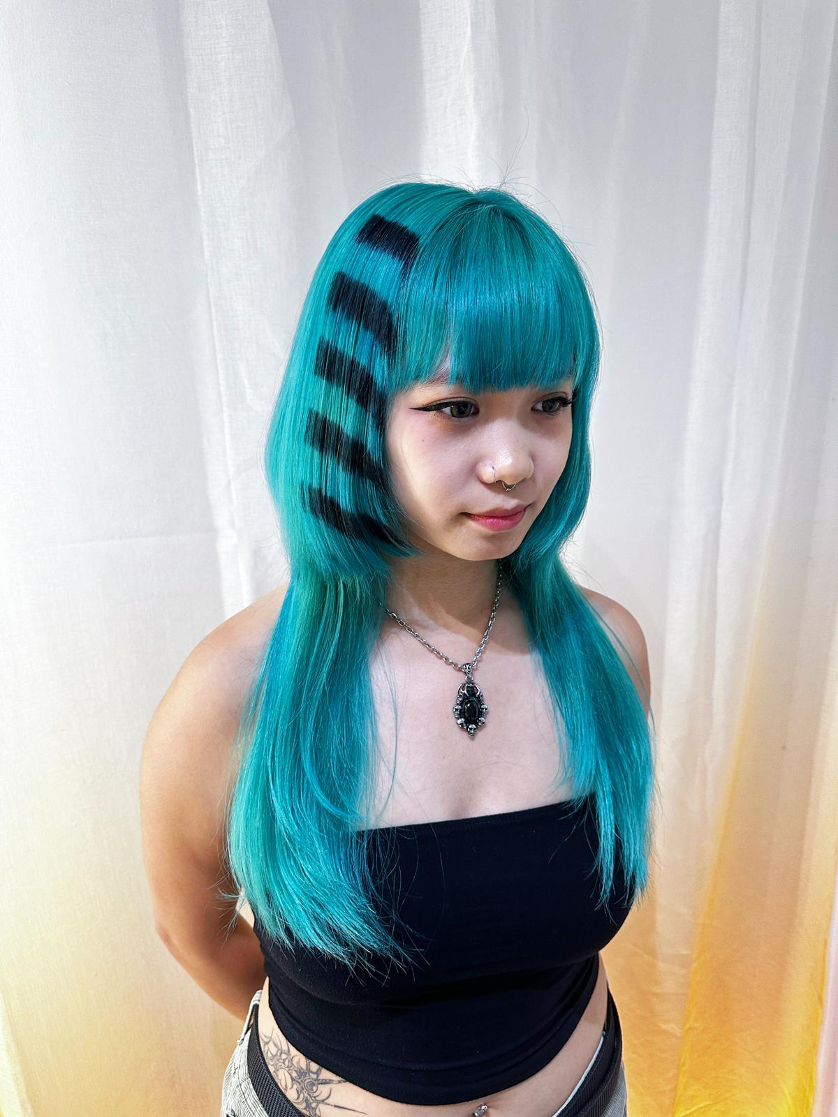 こちらはフルブリーチベースのデザインカラー。高彩度のネオングリーンに、前髪部分へ落とせる黒を使ったストライプデザインを組み合わせています。強いインパクトがありながら、ロングレイヤースタイルと合わせることでバランスの取れた仕上がりになります。