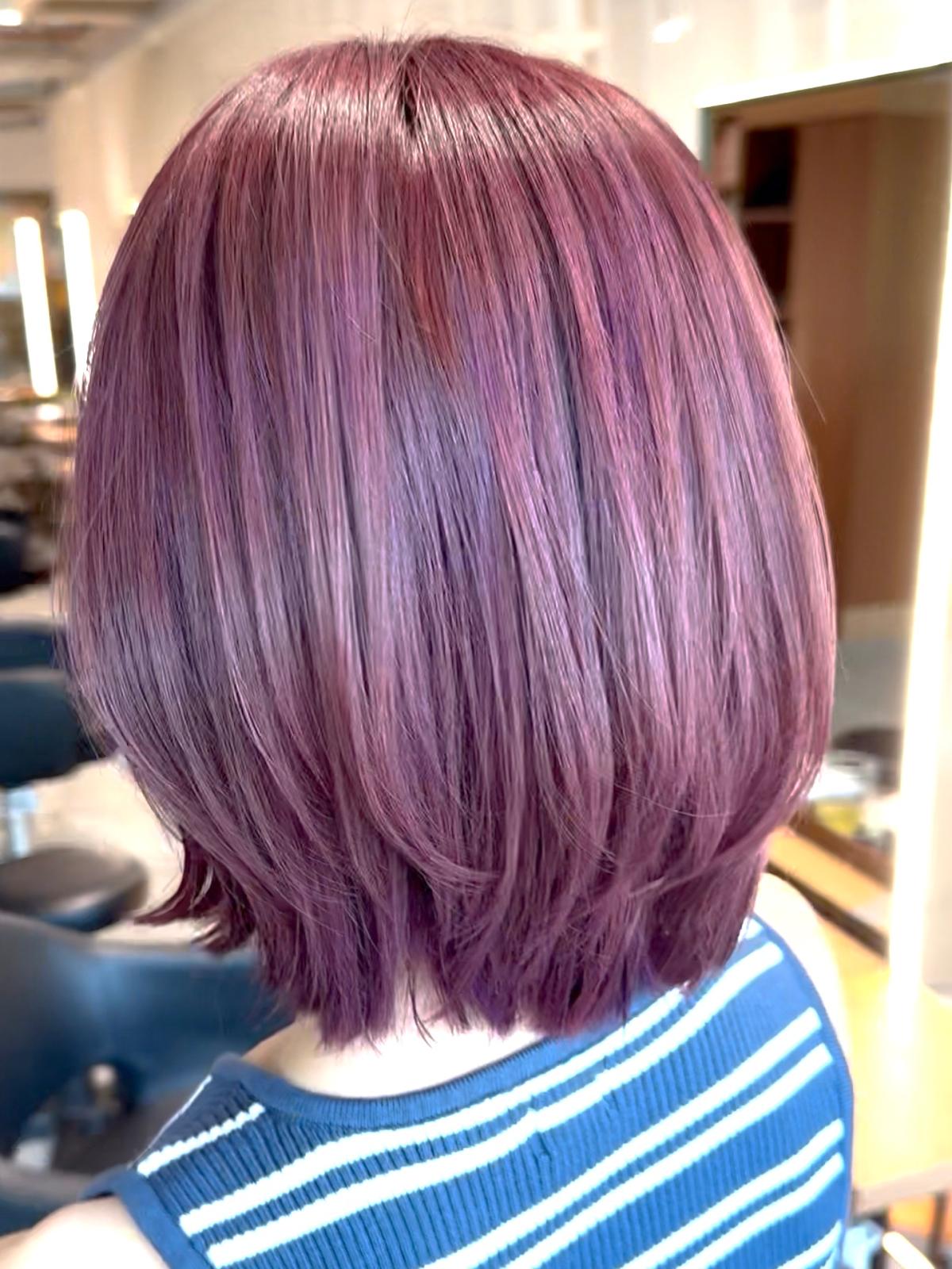 ブリーチにはプレックスを配合し、ダメージを抑えながら髪の強度と艶を保ちます。ピンクバイオレットは透明感がありながら存在感のある色味です。レイヤーは入れすぎず、まとまりやすさを重視した設計にしているため、動きが出ても広がりにくいのが特徴です。