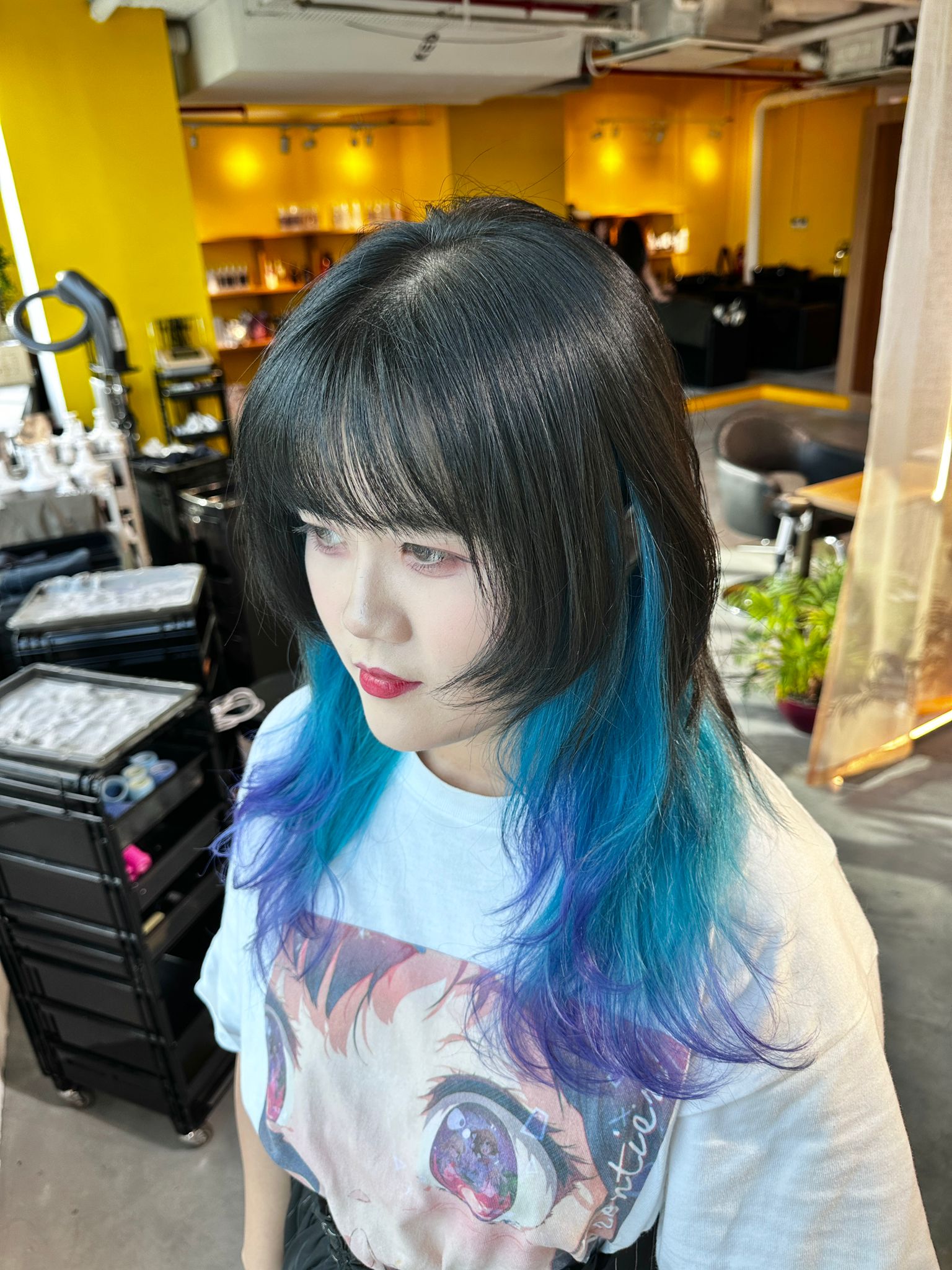 Blue and purple inner color is a popular design color technique at Japanese Hair Salon Singapore. This style adds vibrant color while keeping the outer hair natural and easy to maintain.