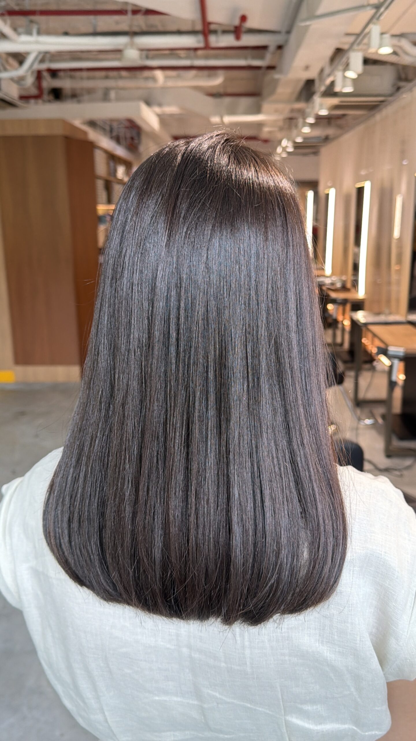 Looking for a dark ash hair color in Singapore that naturally covers grey hair while maintaining shine? This medium-length style at Japanese Hair Salon Singapore combines a structured haircut with a low-damage plex hair color.