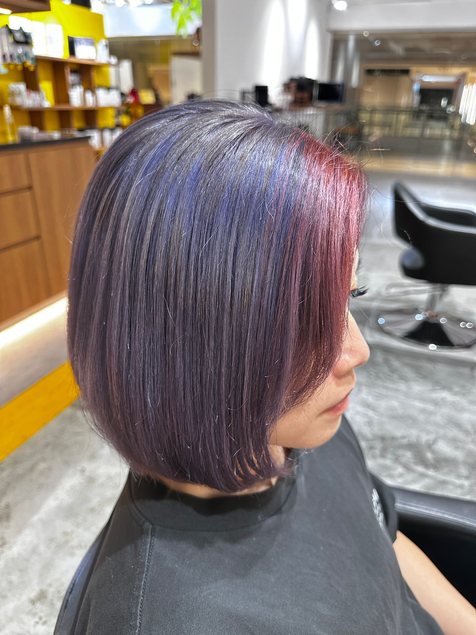 Looking for full bleach design color in Singapore? This red and ash purple combination is a high-impact face frame color on a precision bob haircut.