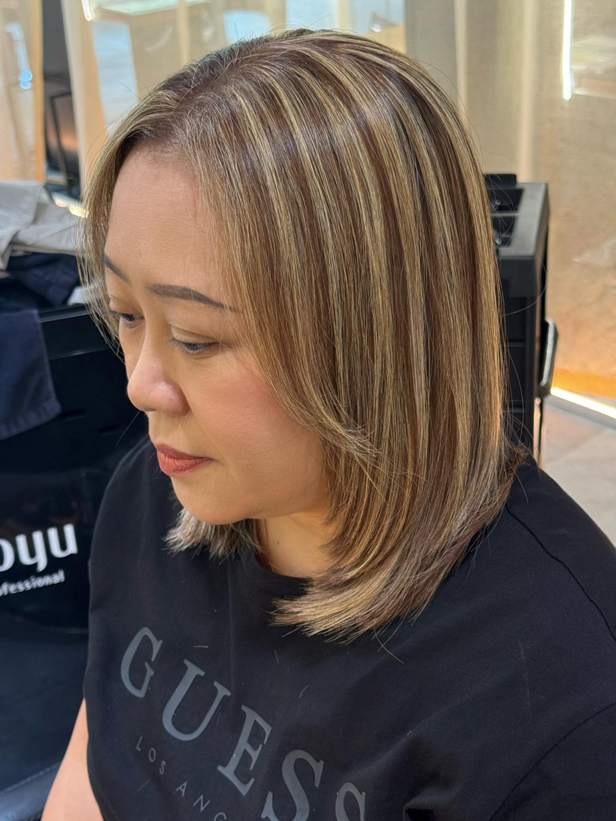 This grey blending highlights bob is designed for clients who want soft, natural coverage with a modern finish at a Japanese hair salon Singapore.