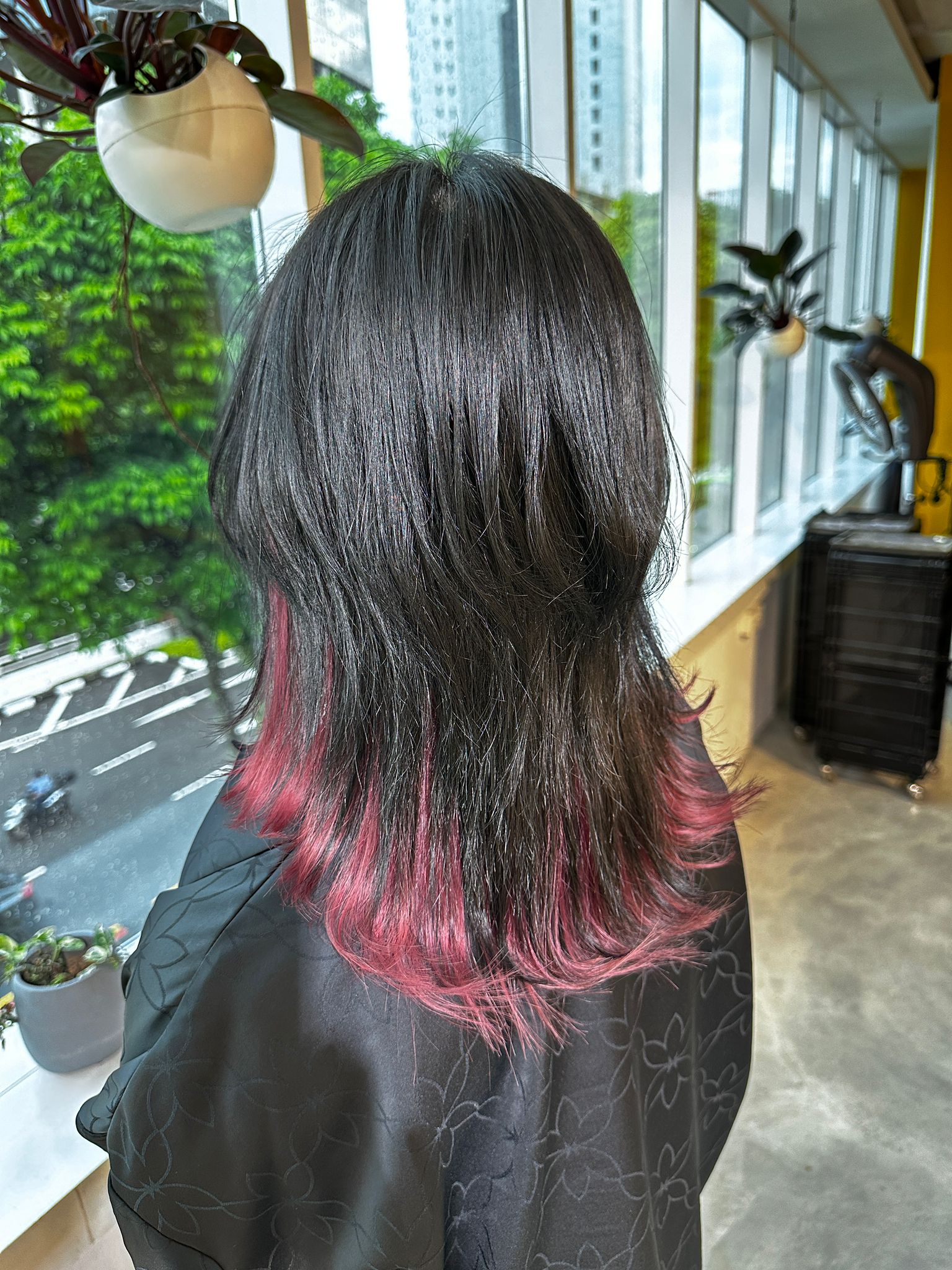 The inner section is selectively bleached and colored vivid red, while the outer layer remains natural. The bleach placement follows the layered structure of the medium wolf haircut, so the color appears balanced and intentional. When the hair moves or is styled with texture, the red subtly reveals itself and creates depth and contrast.