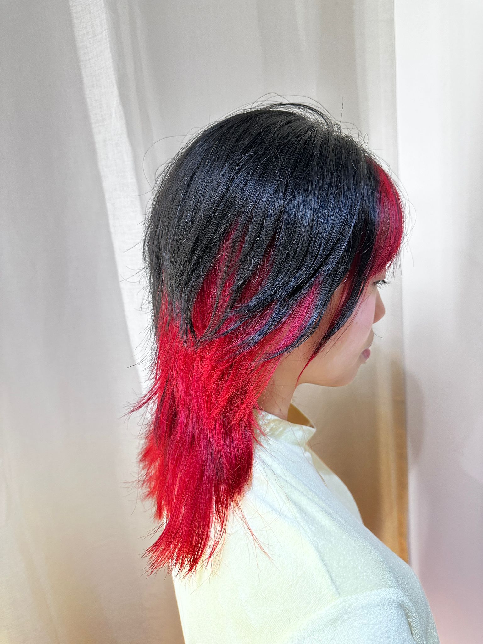 Looking for a bold inner color in Singapore without excessive damage? This inner red and fringe bleach design is perfect for adding strong contrast while keeping your hair healthy at a Japanese hair salon Singapore.
