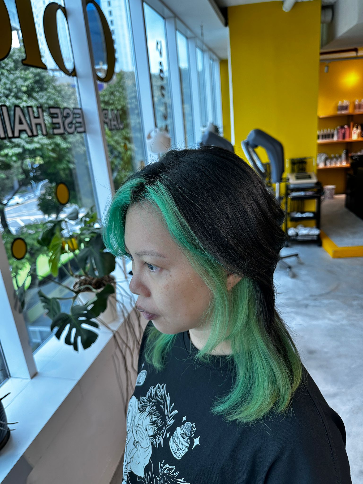 Light green face framing color is a subtle yet creative design color created at Japanese Hair Salon Singapore.