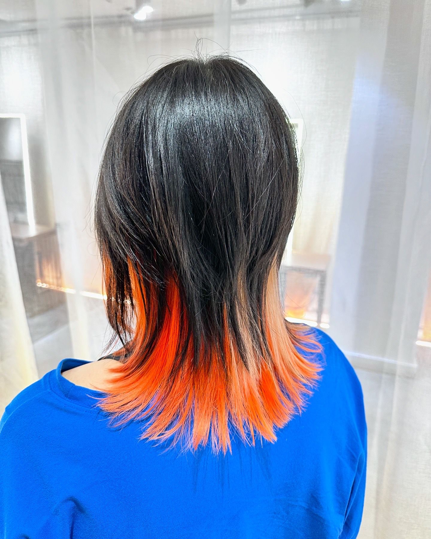 This orange and yellow inner bleach design was created at Colors Japanese Hair Salon Singapore, a Japanese hair salon near Clarke Quay, Chinatown, and Havelock Road. By keeping the surface hair in its natural color, this style balances creativity with practicality, making it ideal for clients who want a bold look without constant maintenance.