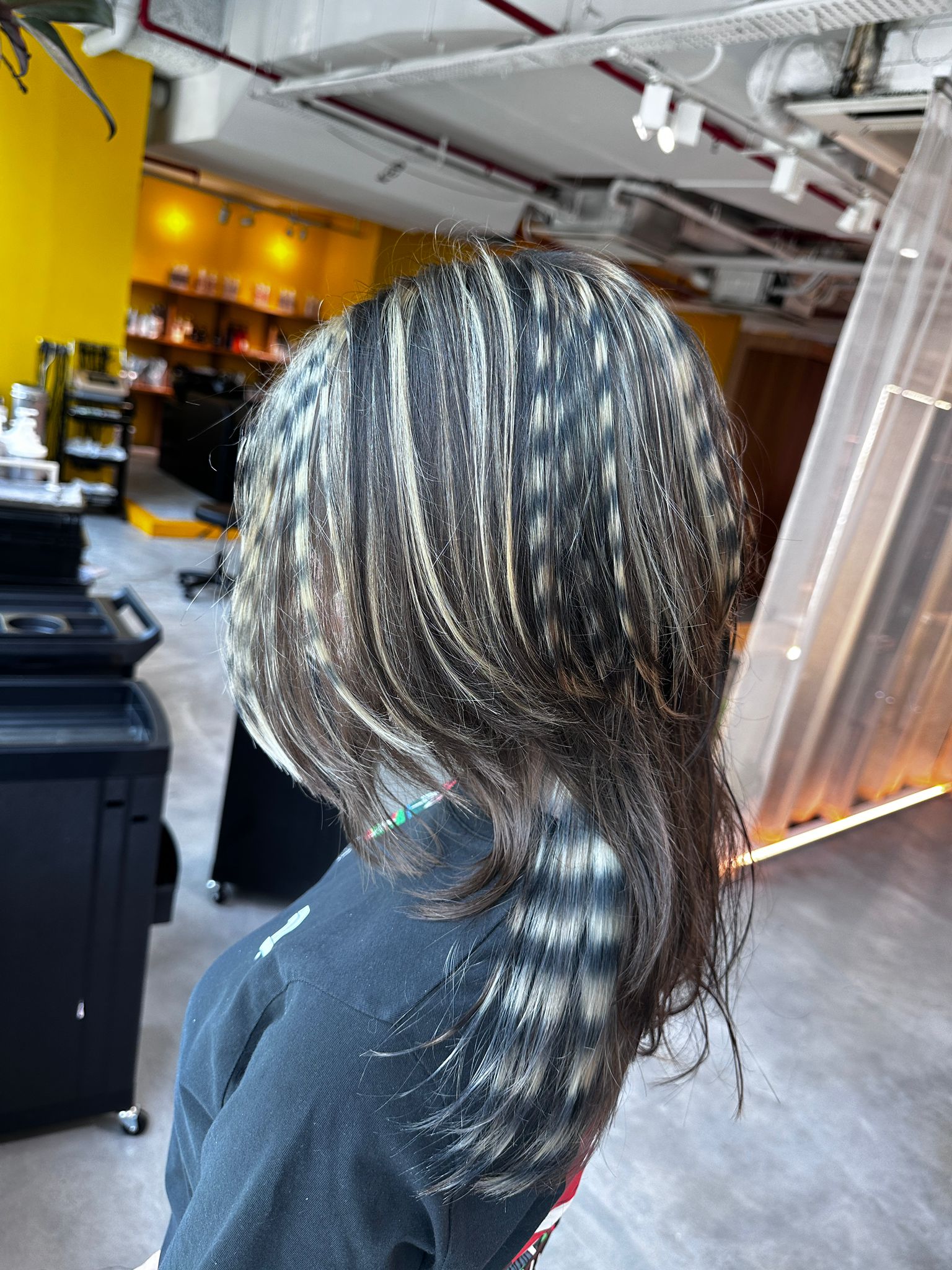 This design is also known as stripe color, panel color, or raccoon hair. Depending on the base color and hair condition, multiple bleach sessions may be required to achieve a clean silver tone. The black used is removable, allowing easier color changes in the future. Regular maintenance and toning are recommended to keep the silver bright.
