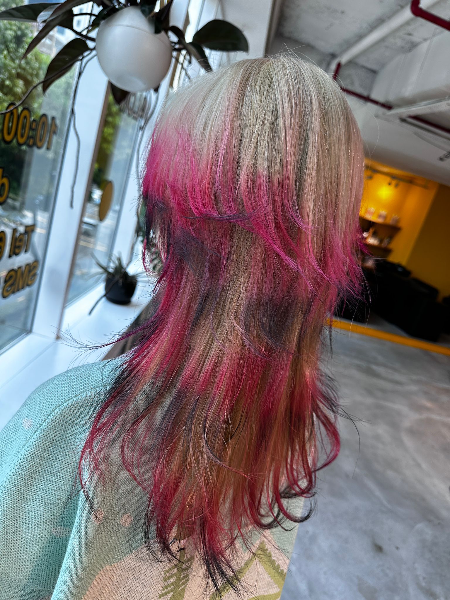 Looking for a bold bleach design at a Japanese hair salon Singapore? This long wolf cut with a red and black dip bleach design is perfect for those who want a strong, edgy look while keeping movement and balance. The contrast color at the ends creates impact without overwhelming the entire hairstyle.