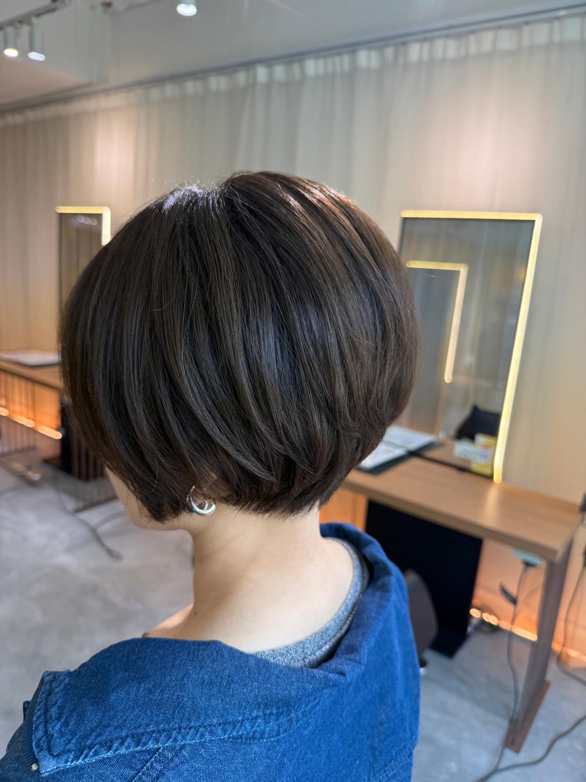 Looking for a Japanese hair salon in Singapore for a short haircut, graduation bob, or grey coverage color? This short graduation bob with dark ash color is ideal for controlling frizz, managing volume, and achieving a neat, compact silhouette. Perfect for humid Singapore weather and low-maintenance styling.