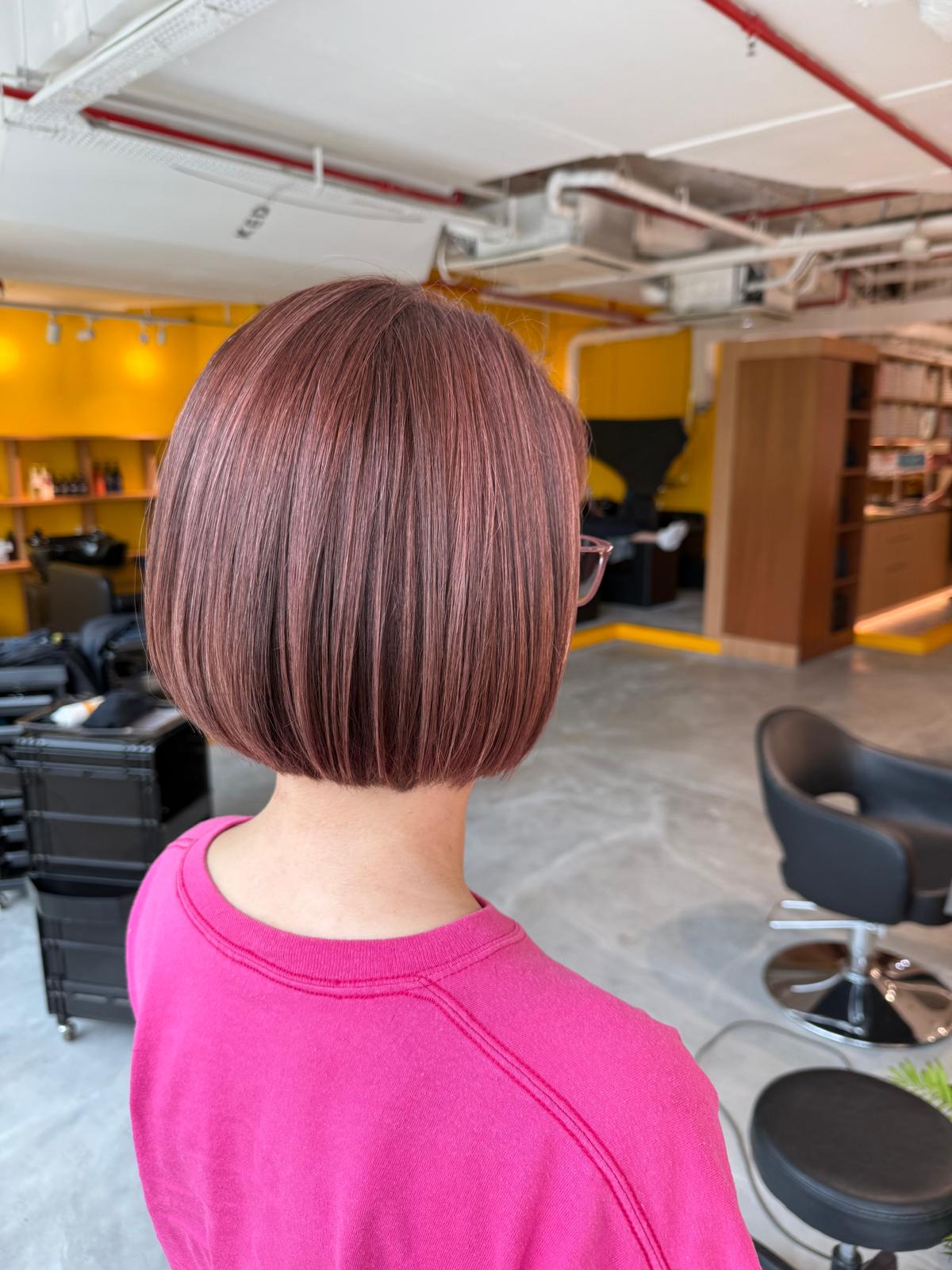 The short bob enhances structure and keeps the look polished, even in Singapore’s humid climate. Pink highlights are strategically placed to soften white hair while adding personality and brightness. As the color fades, it transitions into a lighter, softer pink tone, allowing you to enjoy the color for a longer period without harsh lines.