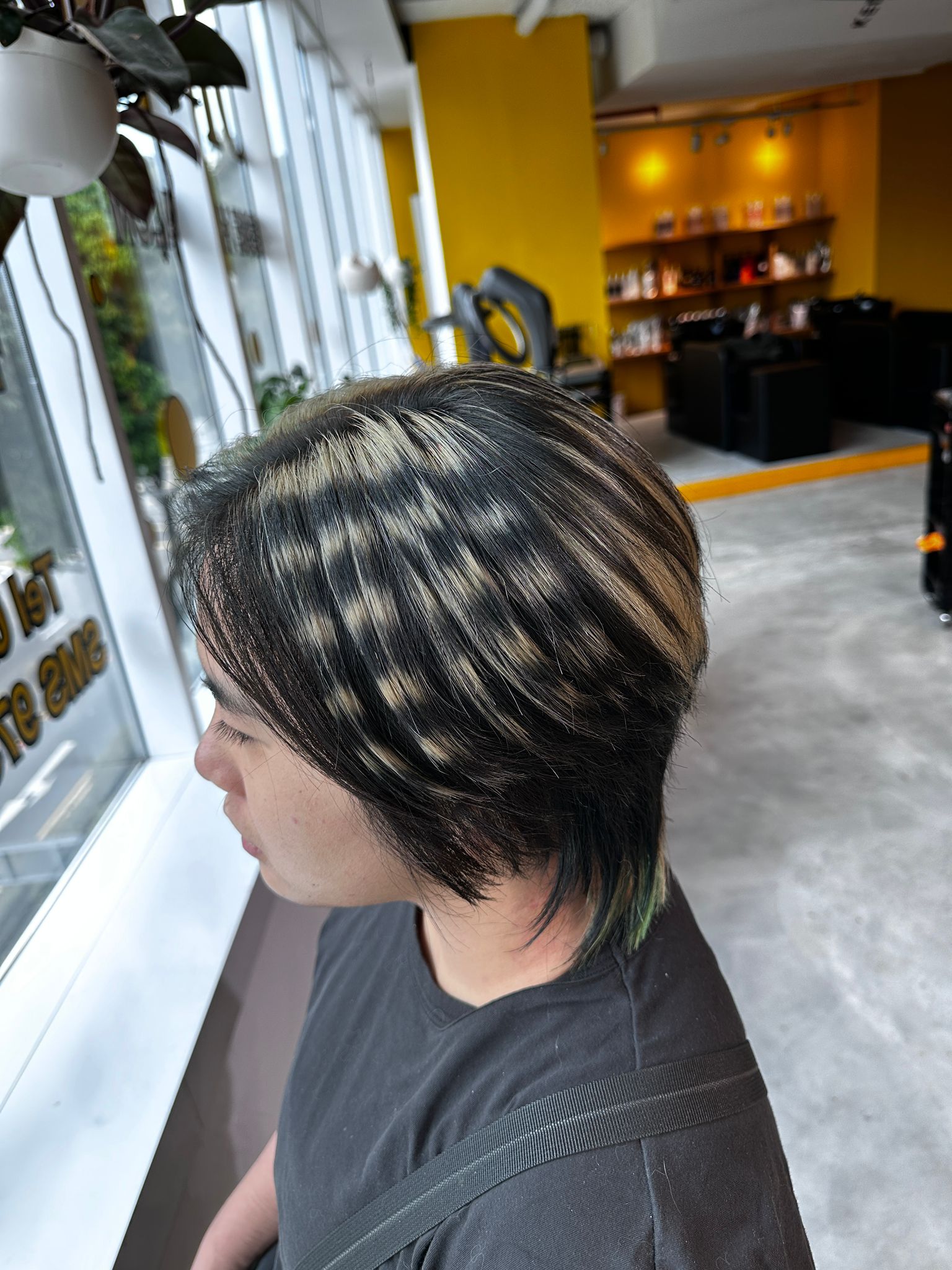 Looking for a unique bleach design at a Japanese hair salon Singapore? This zebra stripe bleach design is perfect for those who want bold, high-contrast highlights with a strong visual impact. Also known as stripe highlights or zebra highlights, this style stands out while keeping damage controlled with point bleach techniques.